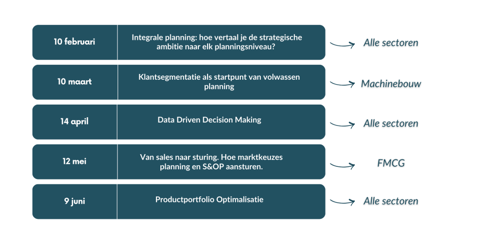 Planning vormt de rode draad, maar de reeks gaat verder dan dat. Groei loopt in de praktijk zelden vast op één proces, maar op samenhang. Besluitvorming zonder goed inzicht. Data die beschikbaar is, maar niet wordt gebruikt. Plannen die niet meebewegen met de werkelijkheid. Het gevolg is bekend. Onrust in de operatie, oplopende voorraden, lagere service en hogere kosten.